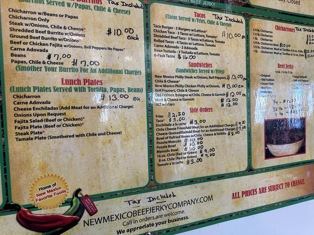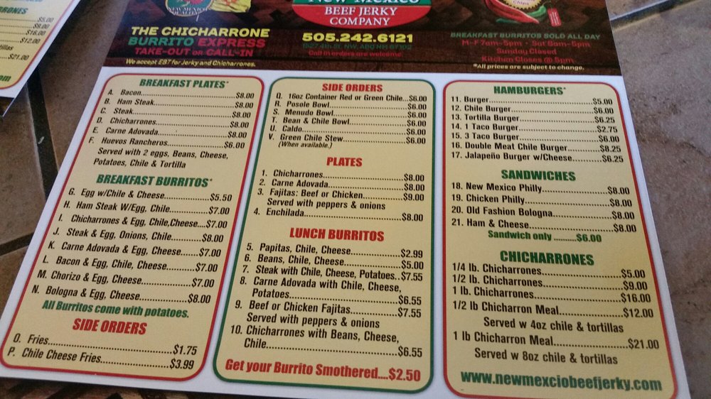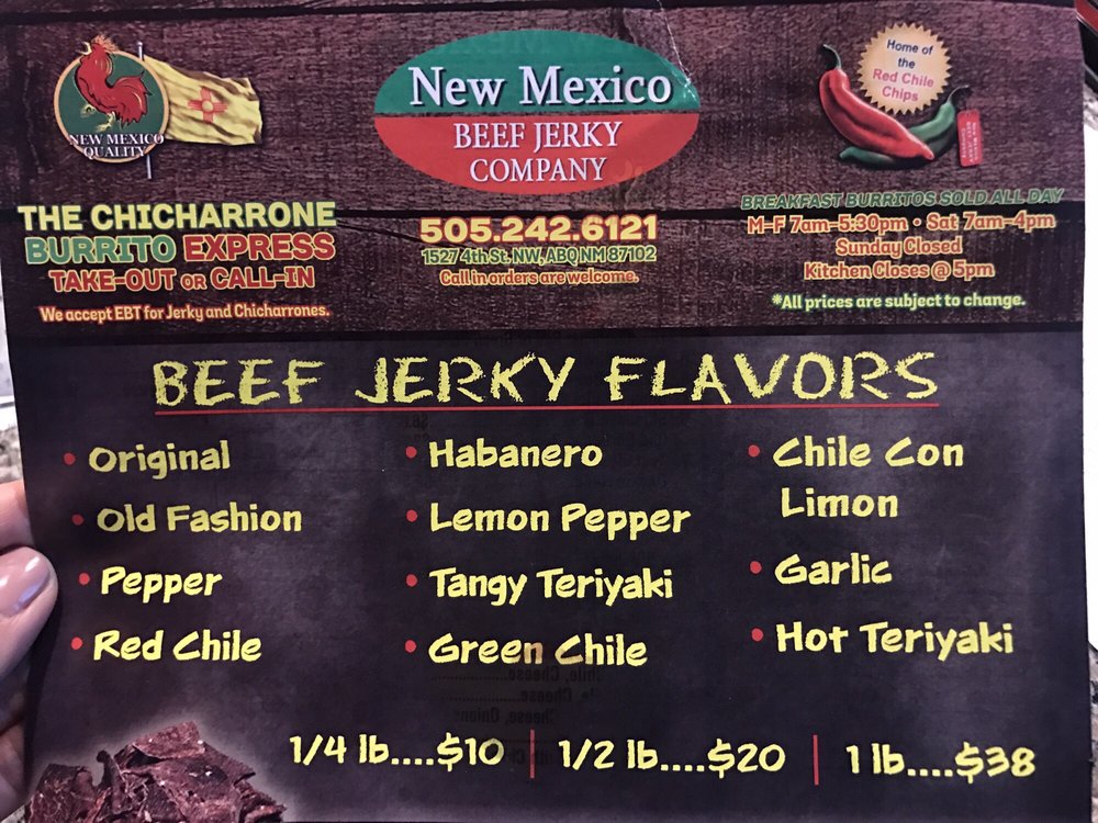 The New Mexico Beef Jerky Company, located in Albuquerque, offers a unique fusion of New Mexican cuisine with a focus on breakfast and brunch options. The menu includes delicious carne asada burritos with green chile that are a crowd favorite. Customers rave about the flavorful chile, generous portion sizes, and the option to customize their burritos. The restaurant also offers a wide selection of fresh jerky in various styles, perfect for those looking for a savory snack. With friendly staff, quick service, and a casual atmosphere, this spot is a must-try for anyone visiting Albuquerque. Don't miss out on their mouth-watering green smothered Carne Adovada breakfast burrito or their spicy green chile that will leave you sweating (in a good way). Overall, New Mexico Beef Jerky Company delivers on both taste and quality, making it a top choice for locals and tourists alike.